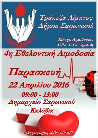Το ραντεβού μας με την ανθρωπιά έφτασε για μια ακόμα φορά. Την Παρασκευή, 22 Απριλίου 2016 από τις 9:00 – 13:00, θα πραγματοποιηθεί η 4η Εθελοντική Αιμοδοσία στον Δήμο Σαρωνικού, στον χώρο του Δημαρχείου, στα Καλύβια.