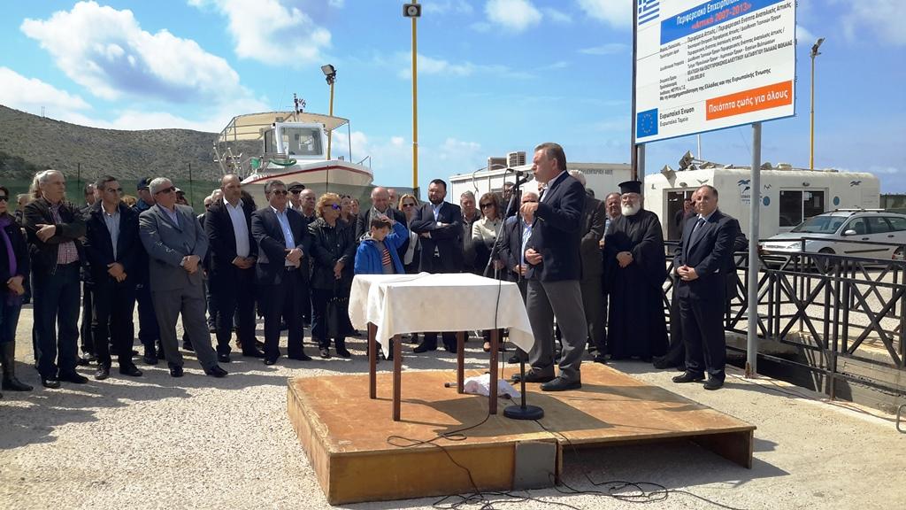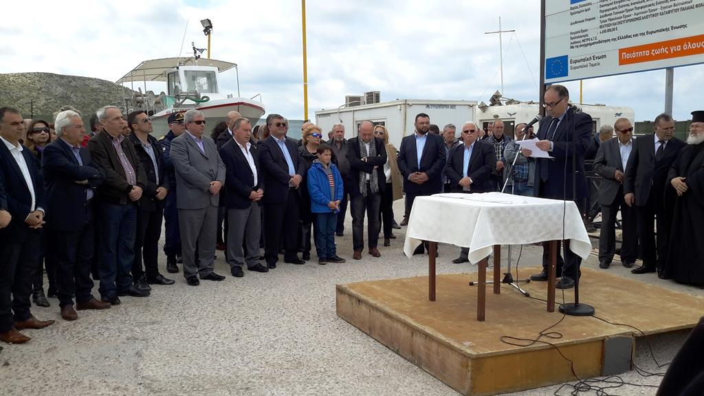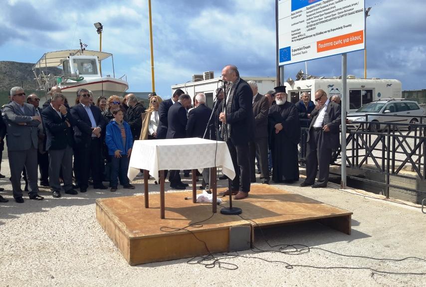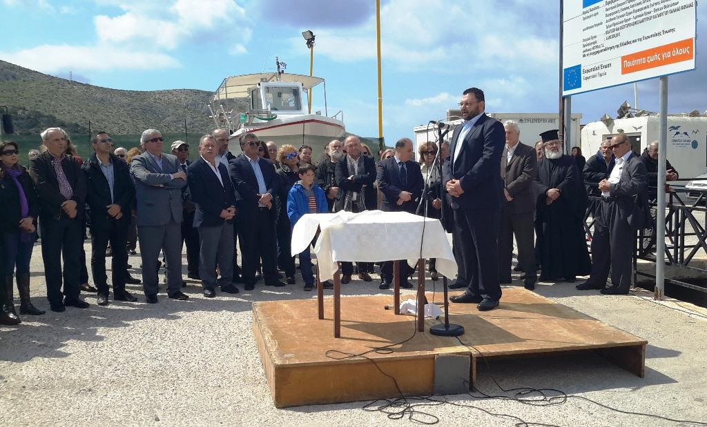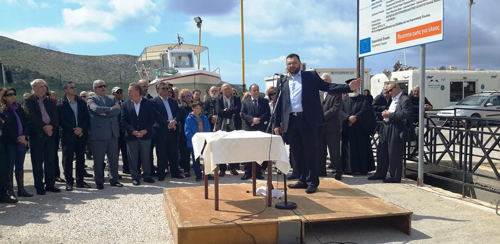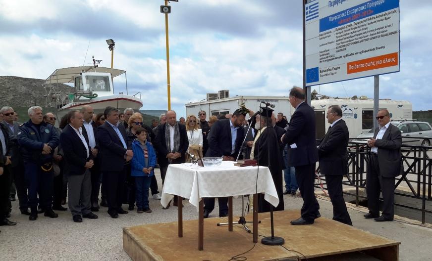 Ο πατήρ Κυριάκος τέλεσε τον αγιασμό, διαβάζοντας ευχές για τους ναυτικούς, την αλειεία και τη θάλασσα. Στη συνέχεια, ο οικοδεσπότης Πρόεδρος της Δημοτικής Ενότητας κ. Νάσος Παπουτσής προλόγισε την εκδήλωση, τονίζοντας το πόσο σημαντική είναι η θετική αυτή εξέλιξη, καθώς πρόκειται για ένα έργο που χρειάστηκαν περισσότερα από είκοσι χρόνια για να ξεπεραστούν τα προκύπτοντα, κυρίως γραφειοκρατικά, προβλήματα μέχρι την τωρινή ευτυχή για όλους κατάληξη.