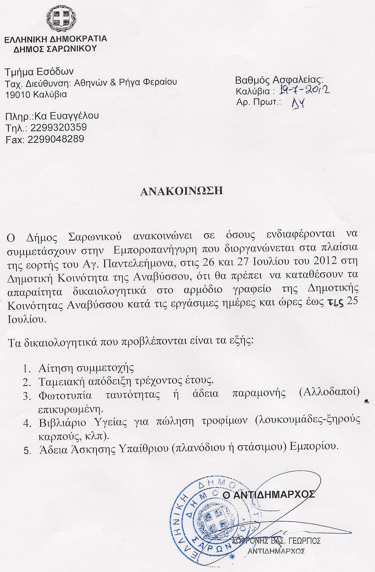 Ανακοίνωση Δήμου Σαρωνικού για την Εμποροπανήγυρη Αγίου Παντελεήμονα Αναβύσσου