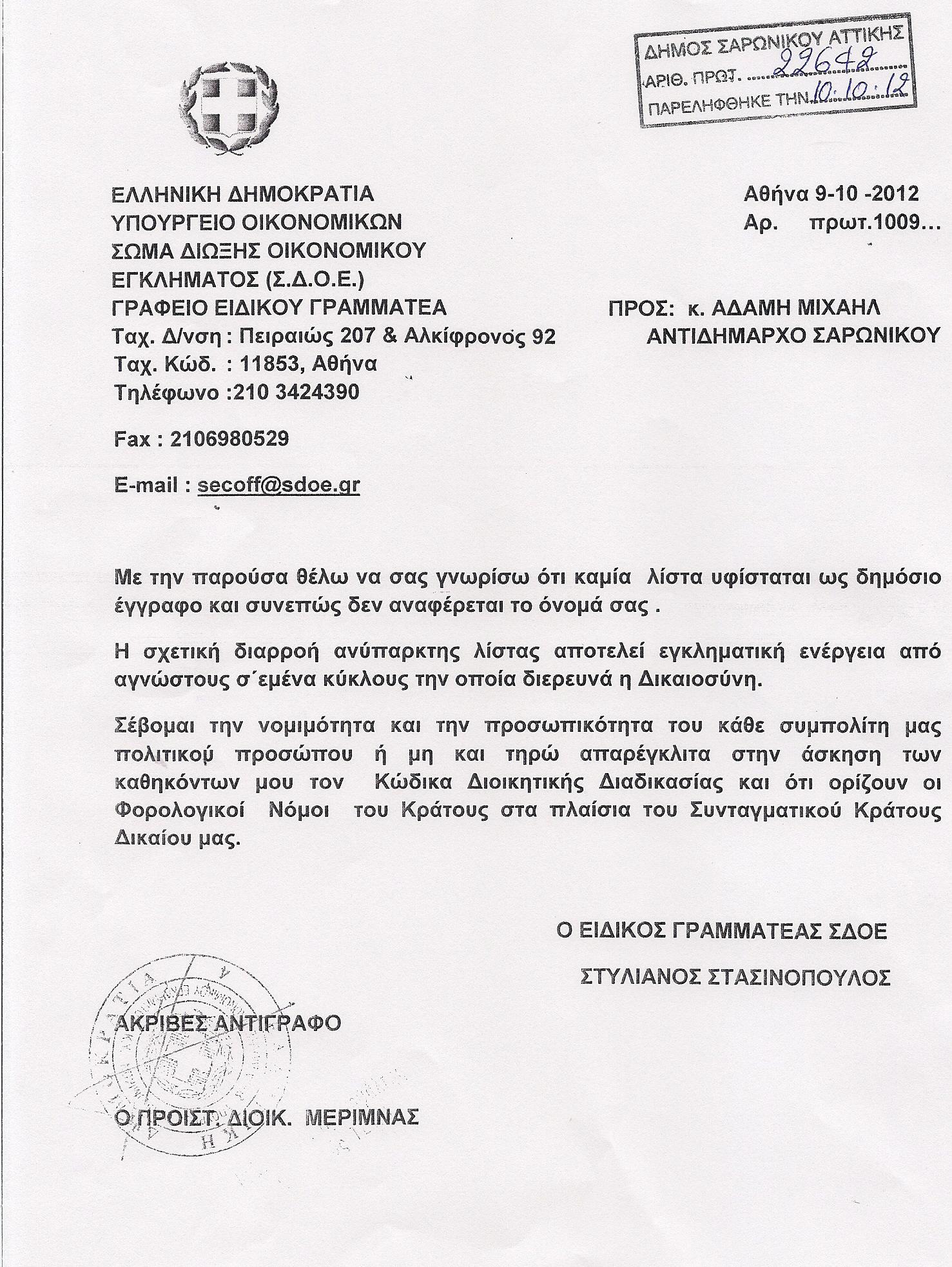 Δεν πέρασαν όμως ούτε 48 ώρες από τη δημοσίευση της συγκεκριμένης «λίστας» και η απάντηση προς τους συκοφάντες και τους σκευωρούς, δόθηκε από το ίδιο το ΣΔΟΕ με έγγραφο που φέρει την υπογραφή του Ειδικού Γραμματεά κ. Στυλιανού Στασινόπουλου, σύμφωνα με το οποίο καμία λίστα δεν υφίσταται ως δημόσιο έγγραφο και συνεπώς δεν αναφέρονται τα ονόματα των κ.κ. Φιλίππου και Αδάμη. Η σχετική διαρροή ανύπαρκτης λίστας αποτελεί εγκληματική ενέργεια από άγνωστους κύκλους την οποία διερευνά η Δικαιοσύνη, αναφέρει στο έγγραφο του το ΣΔΟΕ (το οποίο και σας επισυνάπτουμε).