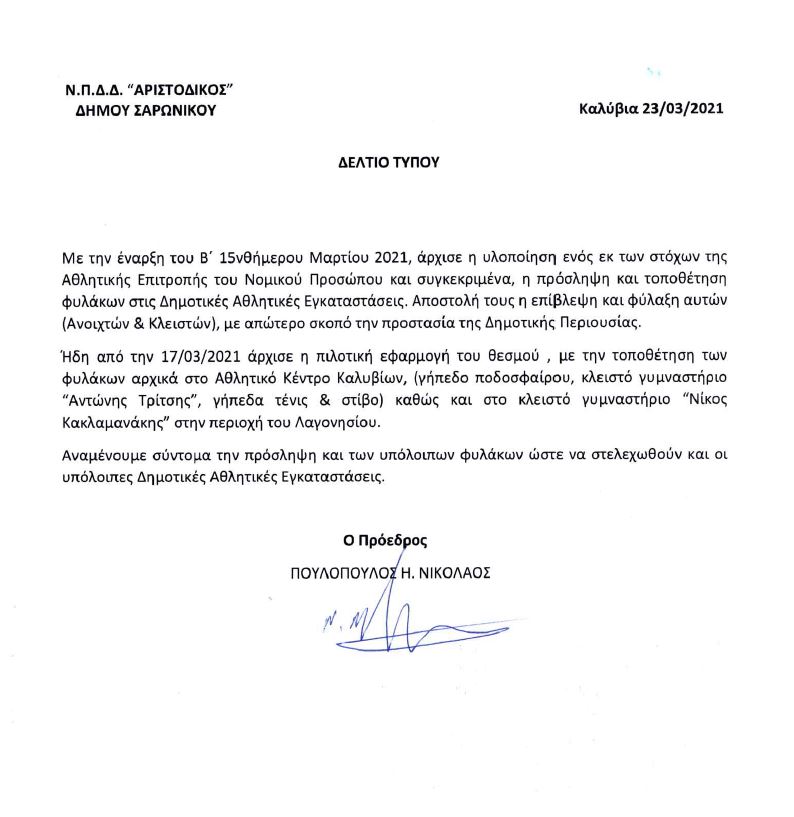 Δελτίο τύπου του ΝΠΔΔ “Αριστόδικος” για πρόσληψη και τοποθέτηση φυλάκων στις Δημοτικές Αθλητικές Εγκαταστάσεις