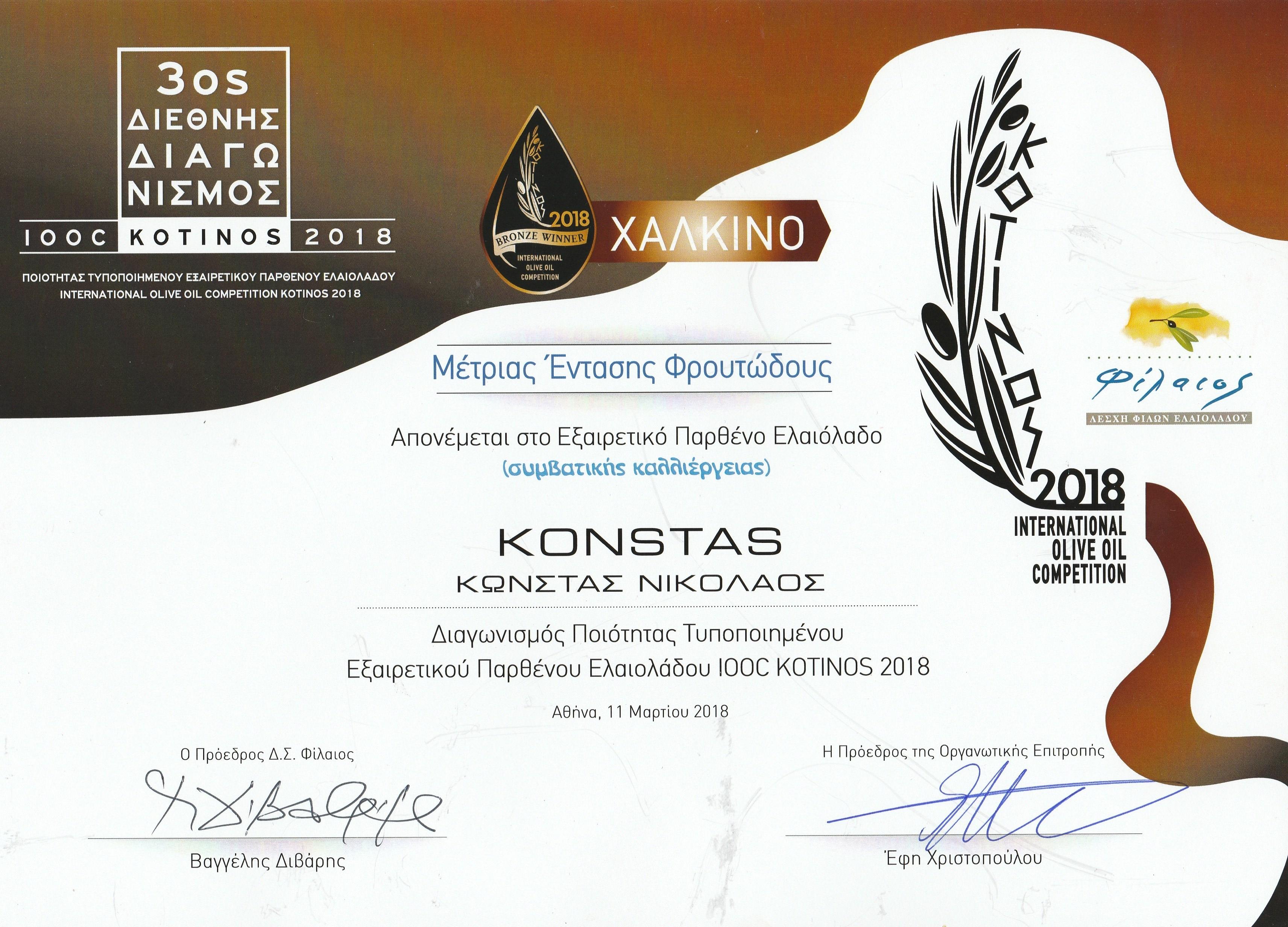 Χάλκινο Βραβείο για την επιχείρηση Konstas Olive Oil, στον διεθνή διαγωνισμό «Κότινος 2018»