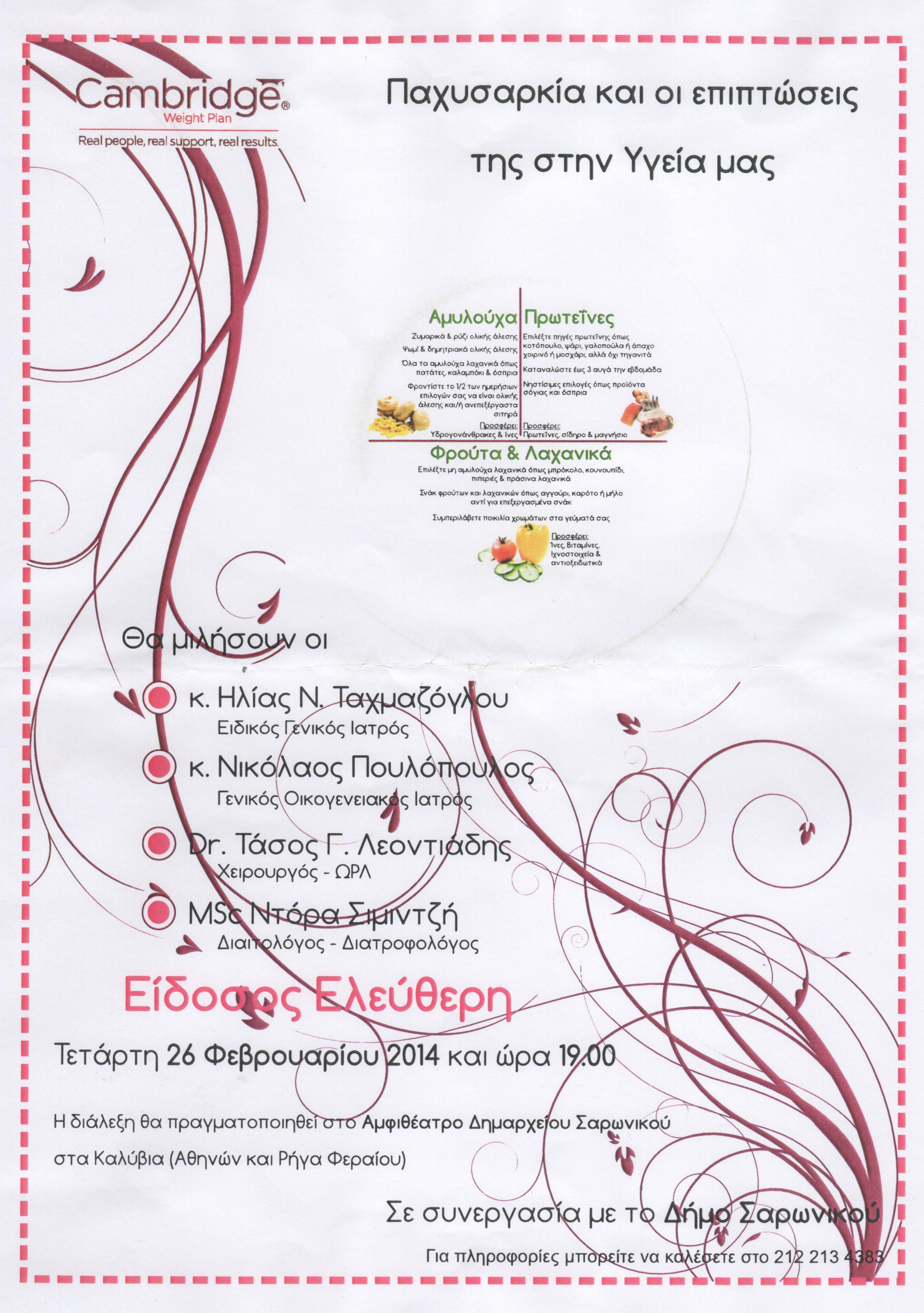Διάλεξη για την παχυσαρκία στο Δημαρχείο Σαρωνικού – Τετάρτη 26 Φεβρουαρίου 2014