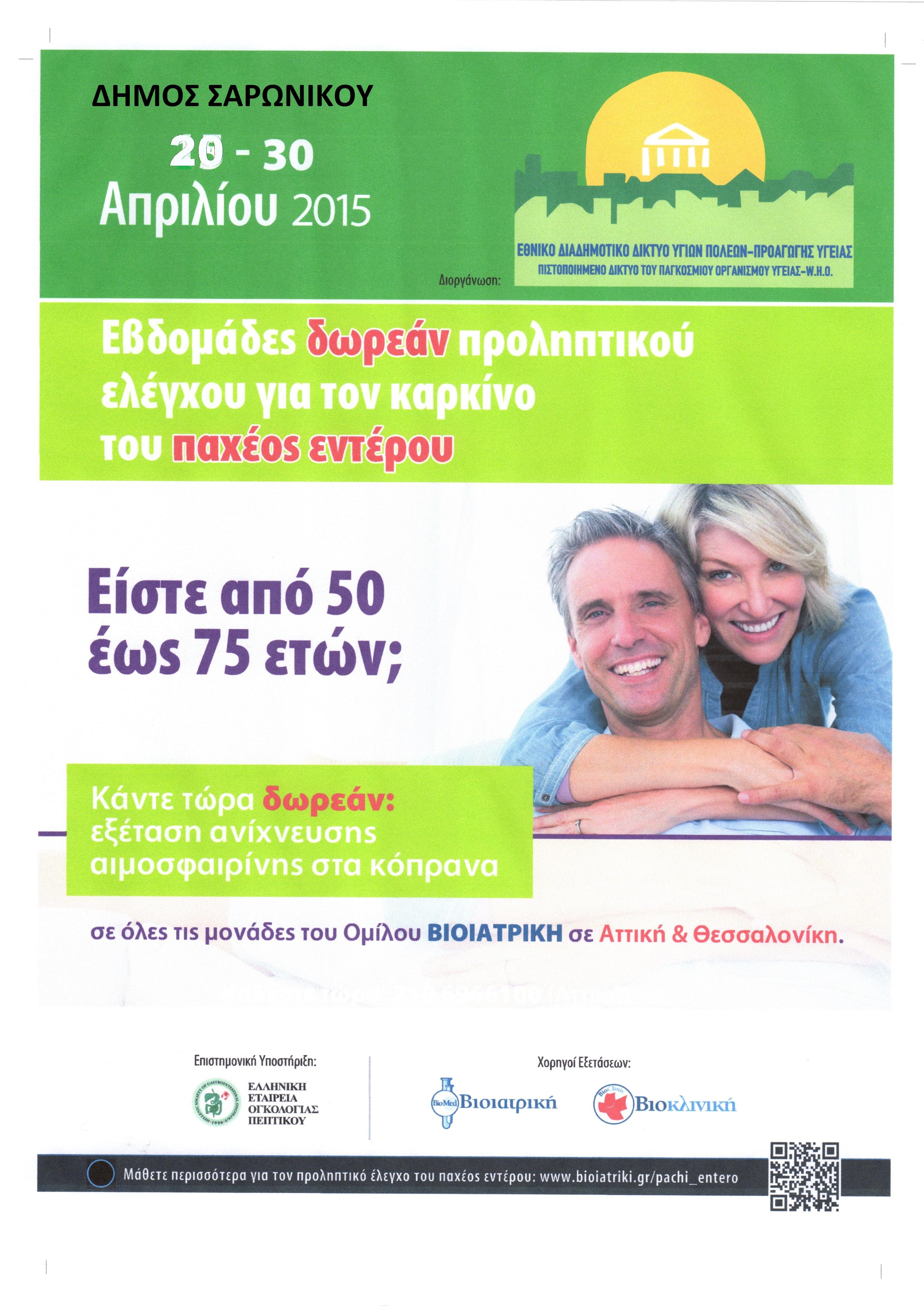 Ο Δήμος Σαρωνικού, μέλος του Εθνικού Διαδημοτικού Δικτύου Υγιών Πόλεων, συμμετέχει στις «εβδομάδες ΔΩΡΕΑΝ προληπτικού ελέγχου για τον καρκίνο του Παχέος Εντέρου».