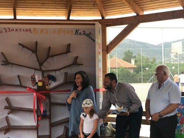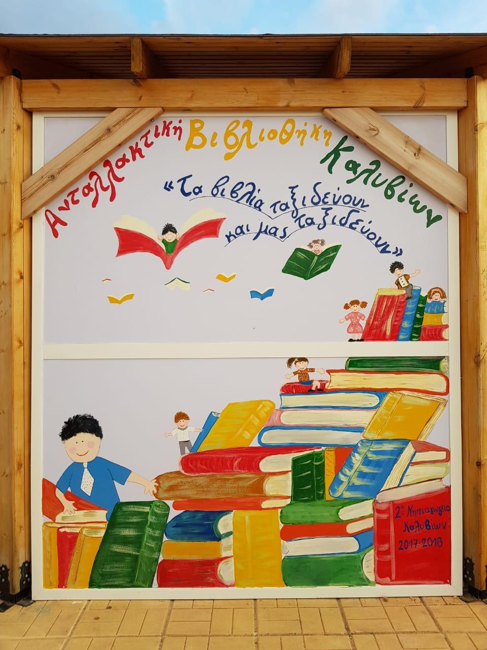 Την Κυριακή 10 Ιουνίου 2018 πραγματοποιήθηκαν τα εγκαίνια της 1ηςΥπαίθριας Ανταλλακτικής Βιβλιοθήκης, που δημιούργησε το 2οΝηπιαγωγείο Καλυβίων, σε συνεργασία με τον Δήμο Σαρωνικού και την Σχολική Επιτροπή Πρωτοβάθμιας Εκπαίδευσης, στο χώρο αναψυχής και αθλοπαιδιών της οδού Γεωργίου Μ. Γκίνη στα Καλύβια.