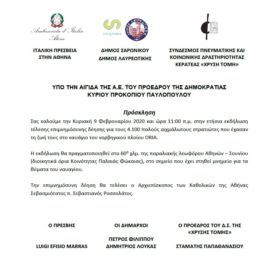 Εκδήλωση μνήμης για τα 4.100 θύματα – αιχμάλωτους Ιταλούς στρατιώτες του νορβηγικού πλοίου ORIA, θα πραγματοποιηθεί και φέτος, 76 χρόνια μετά τη μεγάλη ναυτική τραγωδία, την Κυριακή 9 Φεβρουαρίου 2020 και ώρα 11:00π.μ. στο 60ο χλμ της παραλιακής λεωφόρου Αθηνών – Σουνίου (στα όρια της Κοινότητας Παλαιάς Φώκαιας).