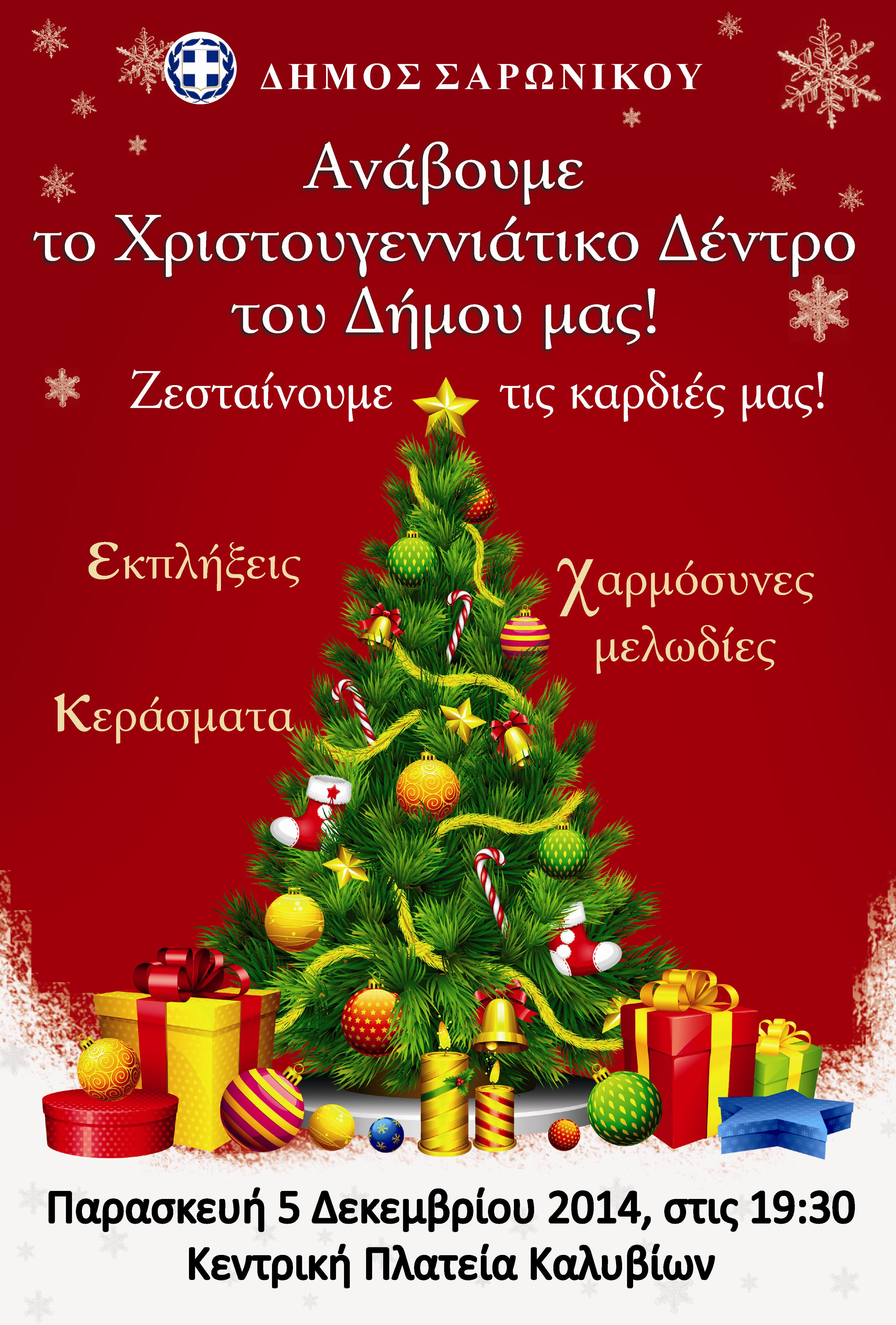 Την Παρασκευή 5 Δεκεμβρίου 2014 στις 19:30 ο Δήμος Σαρωνικού ανάβει το Χριστουγεννιάτικο Δέντρο στην Κεντρική Πλατεία των Καλυβίων.