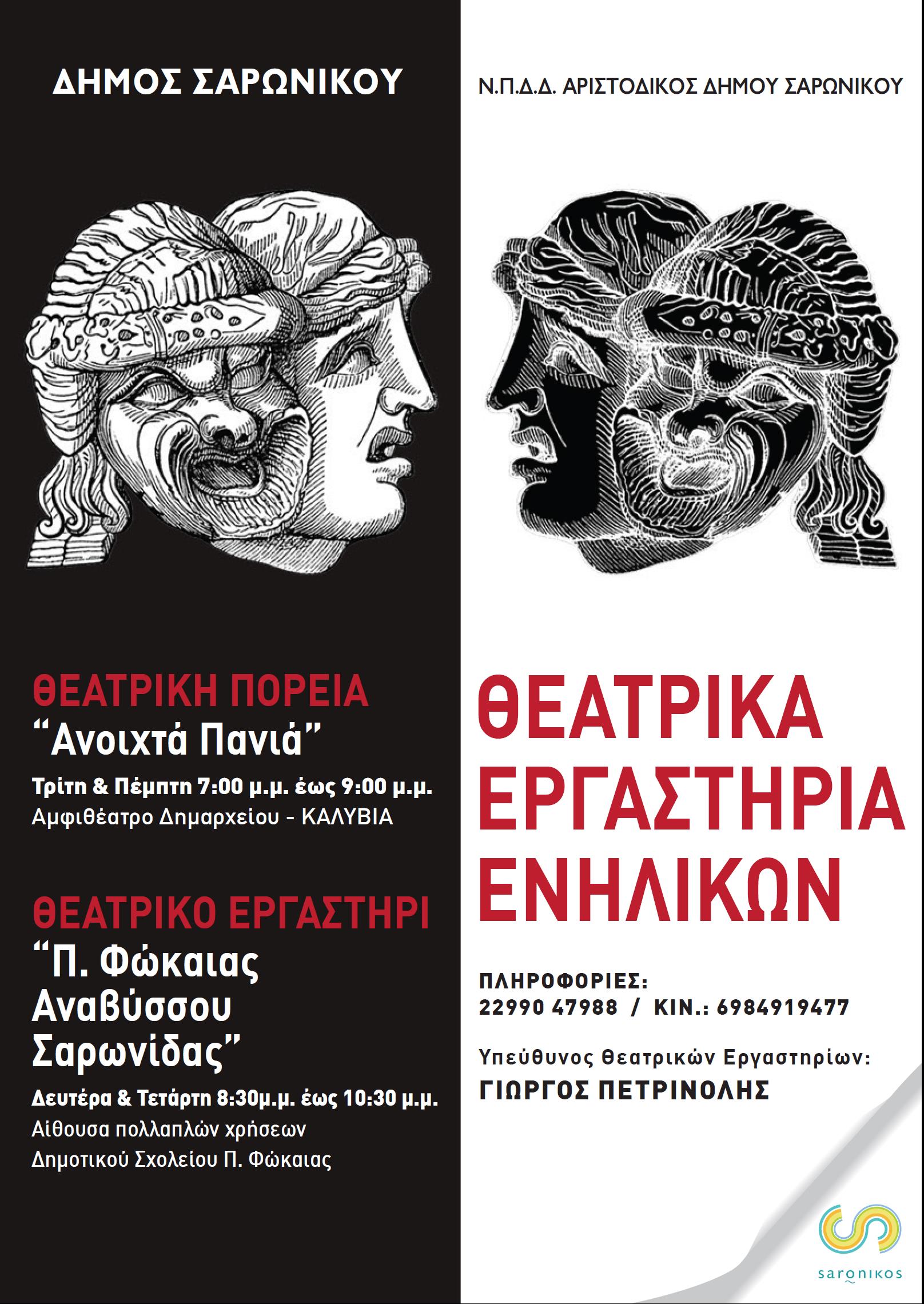 Ξεκινούν οι Εγγραφές στα θεατρικά εργαστήρια (Θεατρική Πορεία "Ανοιχτά Πανιά" και Θεατρικό Εργαστήρι Π.Φώκαιας, Αναβύσσου και Σαρωνίδας) ενηλίκων του Δήμου Σαρωνικού.