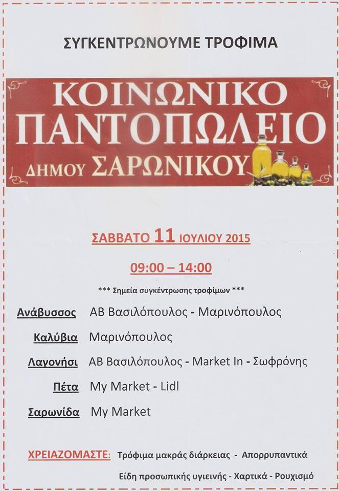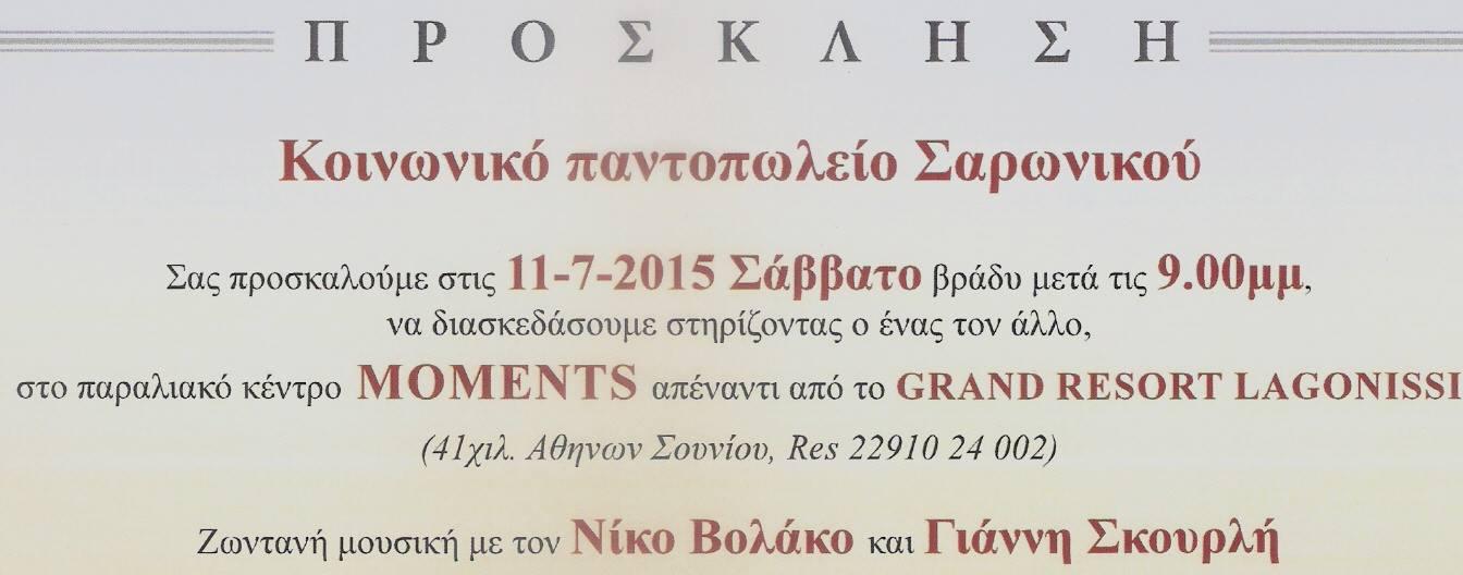 Το Σάββατο, 11 Ιουλίου 2015, στις 21:00, το Κοινωνικό Παντοπωλείο του Δήμου Σαρωνικού διοργανώνει βραδιά με ζωντανή μουσική στο παραλιακό κέντρο “Moments”, επί της λεωφόρου Αθηνών –Σουνίου. Κάτοικοι και επισκέπτες  του Δήμου θα περάσουν μια υπέροχη βραδιά, δίπλα στη θάλασσα, απολαμβάνοντας το ποτό τους και συμβάλλοντας στην ενίσχυση του κοινωνικού Παντοπωλείου.