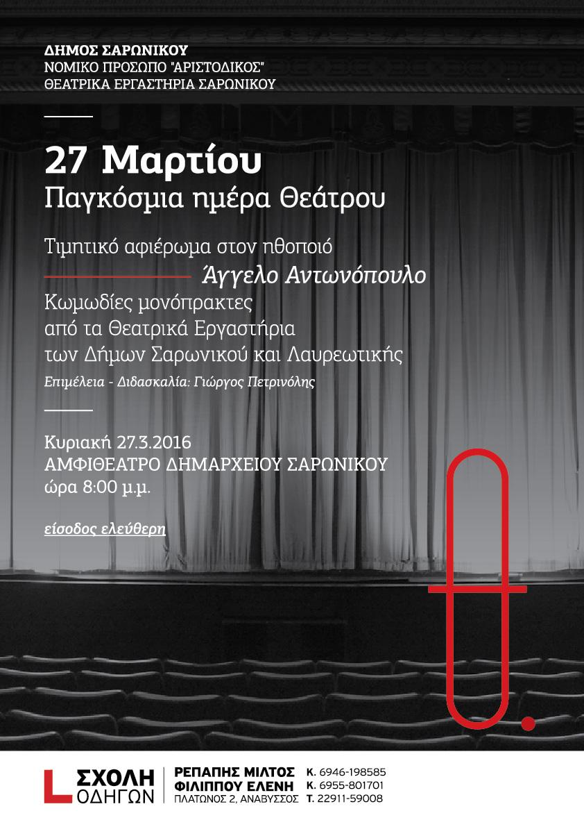 Ο Δήμος Σαρωνικού, για μια ακόμα χρονιά, γιορτάζει την Παγκόσμια Ημέρα Θεάτρου, με ειδικά σχεδιασμένες εκδηλώσεις από το Νομικό Πρόσωπο «ΑΡΙΣΤΟΔΙΚΟΣ» και το Θεατρικό Εργαστήρι.