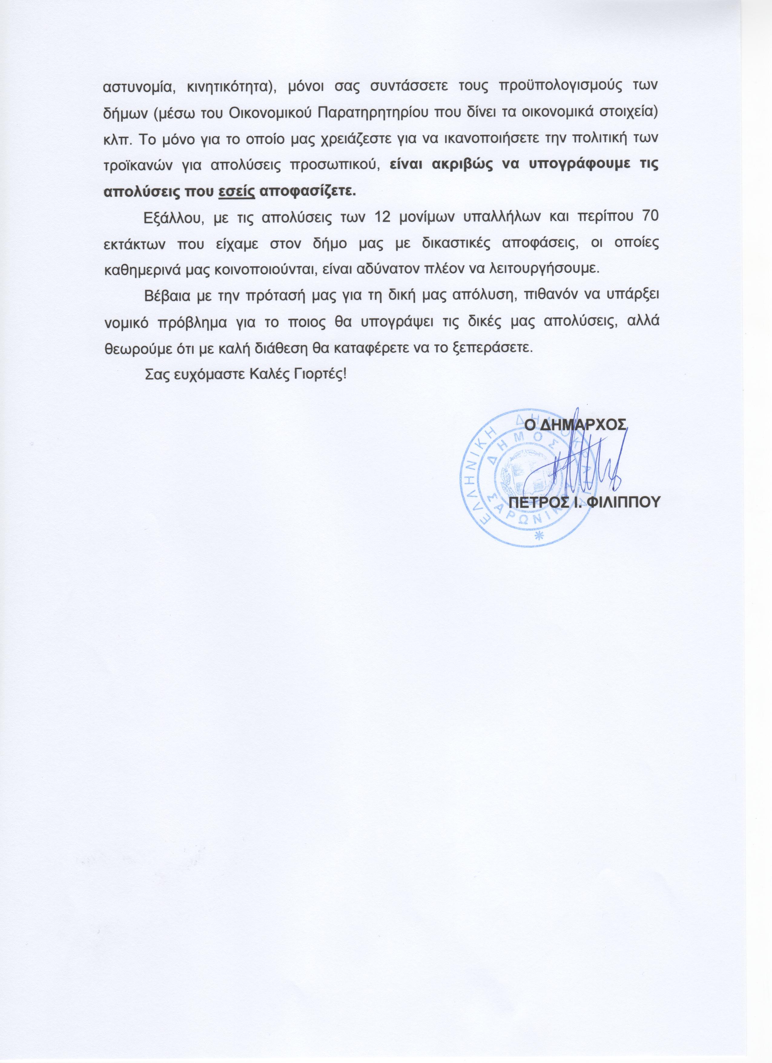 Επειδή η εκτίμηση αυτή έχει προκύψει μετά από προσμέτρηση και των αιρετών (Δημάρχου, αντιδημάρχων, δημοτικών συμβούλων κλπ), ο Δήμαρχος Σαρωνικού προτείνει στους αρμόδιους υπουργούς να προχωρήσουν στη δική τους απόλυση για να μπορέσουν να ισοσκελίσουν τους αριθμητικούς τους υπολογισμούς. Εξάλλου, όπως επισημαίνει στην επιστολή του ο κ. Φιλίππου «οι αιρετοί –εκλεγμένες διοικήσεις των δήμων δεν παίζουν κανέναν απολύτως ρόλο στις αποφάσεις που λαμβάνετε», για να συμπληρώσει στη συνέχεια του κειμένου ότι «το μόνο για το οποίο μας χρειάζεστε για να ικανοποιήσετε την πολιτική των τροϊκανών για απολύσεις προσωπικού, είναι ακριβώς να υπογράφουμε τις απολύσεις που εσείς αποφασίζετε».