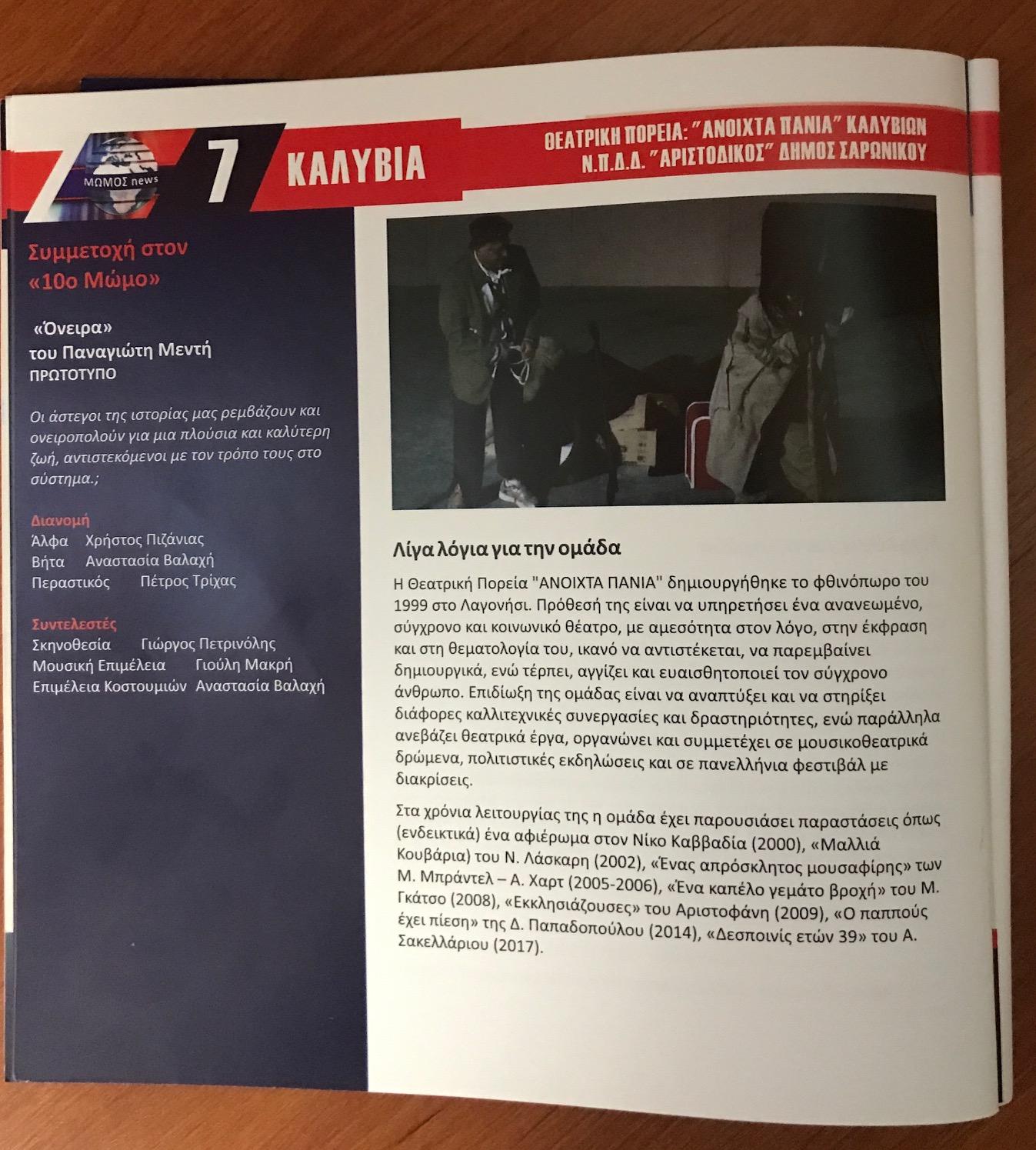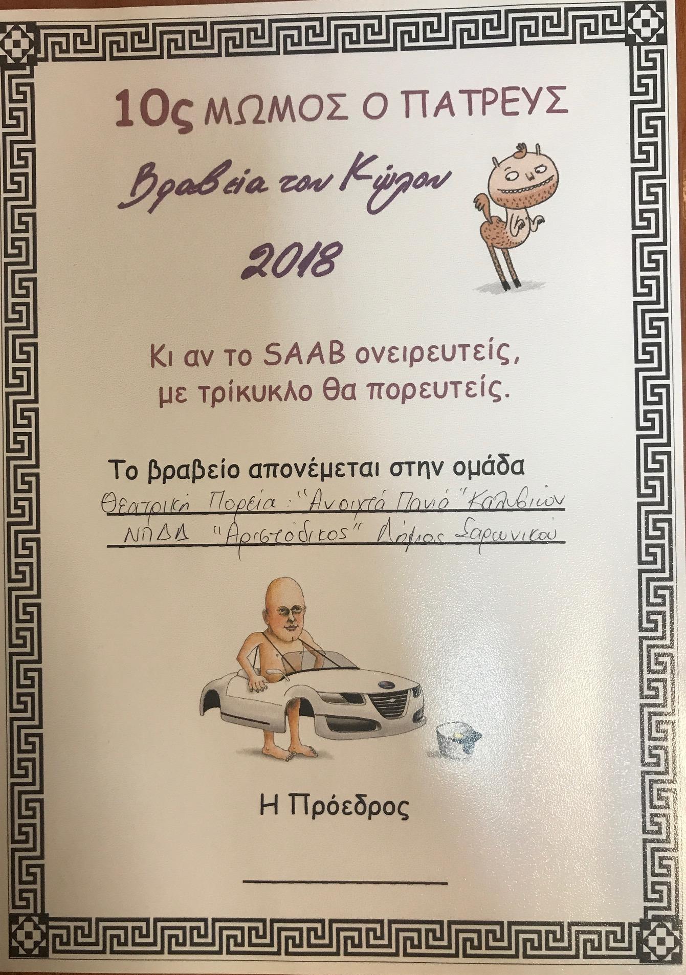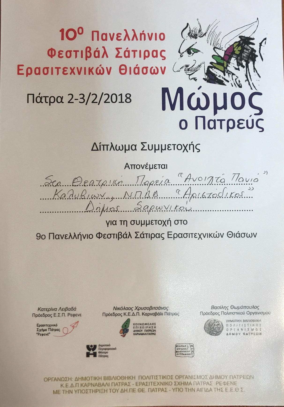 Το Θεατρικό Εργαστήρι ΑΝΟΙΧΤΑ ΠΑΝΙΑ του ΝΠΔΔ «Αριστόδικος» του Δήμου Σαρωνικού, συμμετείχε με επιτυχία στο 10ο Πανελλήνιο Φεστιβάλ Σάτιρας Ερασιτεχνικών Θιάσων «Μώμος ο Πατρεύς», που διοργανώθηκε στην Πάτρα από τις 2 έως τις 4 Φεβρουαρίου.