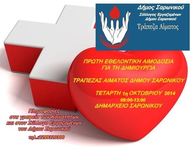 Ο Δήμος Σαρωνικού σε συνεργασία με το Σύλλογο Εργαζομένων Δήμου Σαρωνικού διοργανώνουν Εθελοντική Αιμοδοσία την Τετάρτη 1η Οκτωβρίου 2014, με στόχο τη δημιουργία τράπεζας αίματος Δήμου Σαρωνικού.