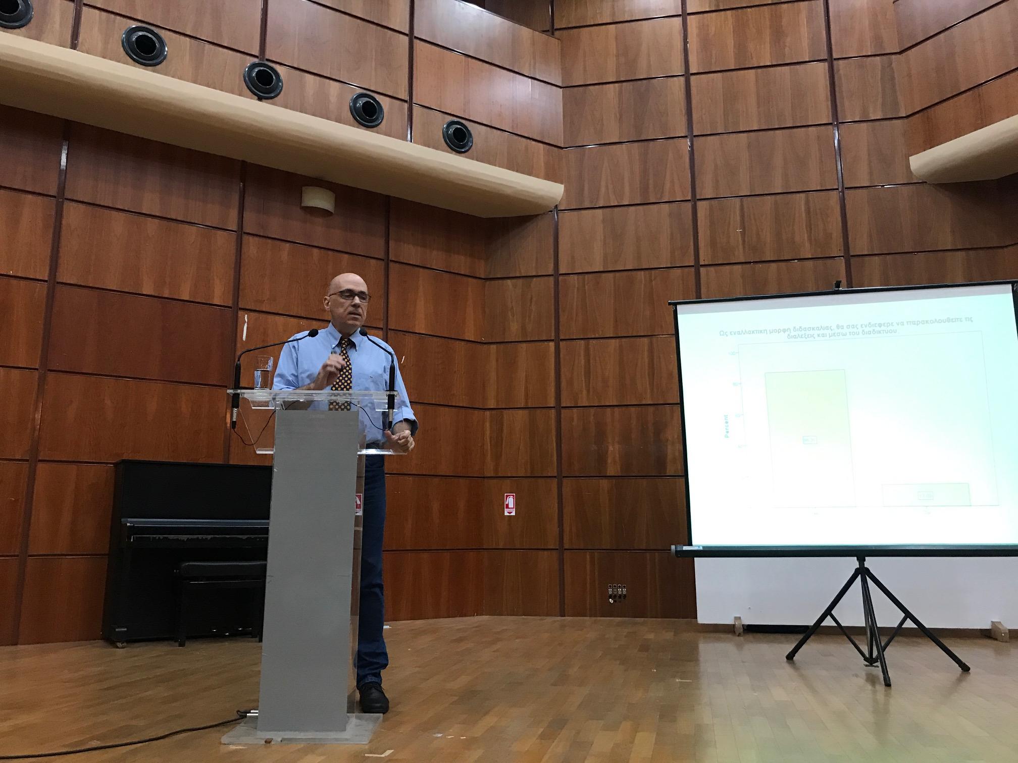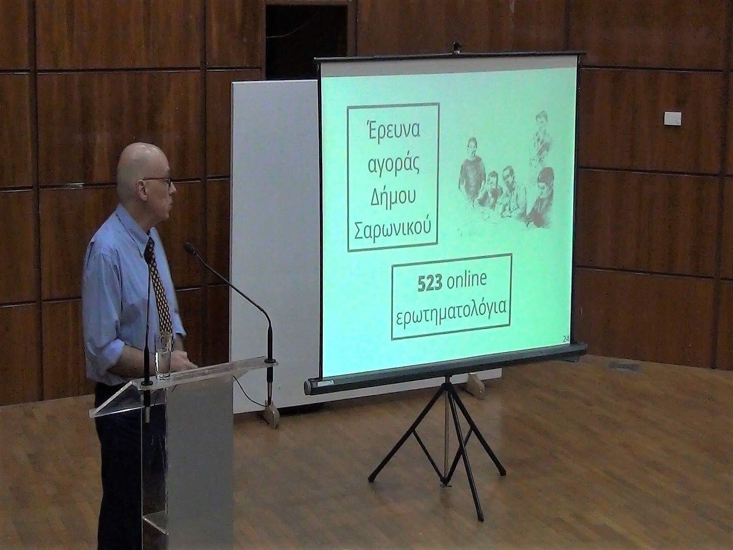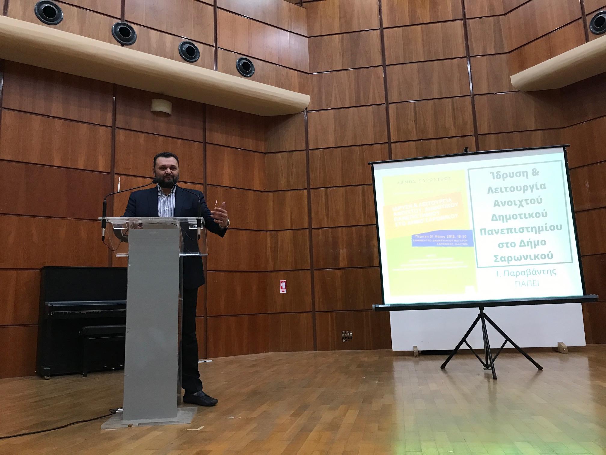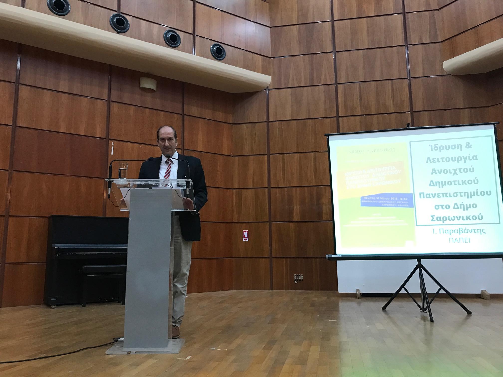 Στη συνέχεια, ο Αναπληρωτής Καθηγητής του Πανεπιστημίου Πειραιώς, κ. Ιωάννης Παραβάντης,αναφέρθηκε στο θεσμικό πλαίσιο της ανάπτυξης προγραμμάτων Δια Βίου Μάθησης από την Τοπική Αυτοδιοίκηση. Παρουσίασε, επίσης, τα αποτελέσματα ηλεκτρονικής έρευνας που διενεργήθηκε στο Δήμο Σαρωνικού, προκειμένου να διερευνηθούν οι ανάγκες και οι προτιμήσεις των πολιτών, σχετικά με τη λειτουργία και το περιεχόμενο σπουδών του Δημοτικού Ανοιχτού Πανεπιστημίου.