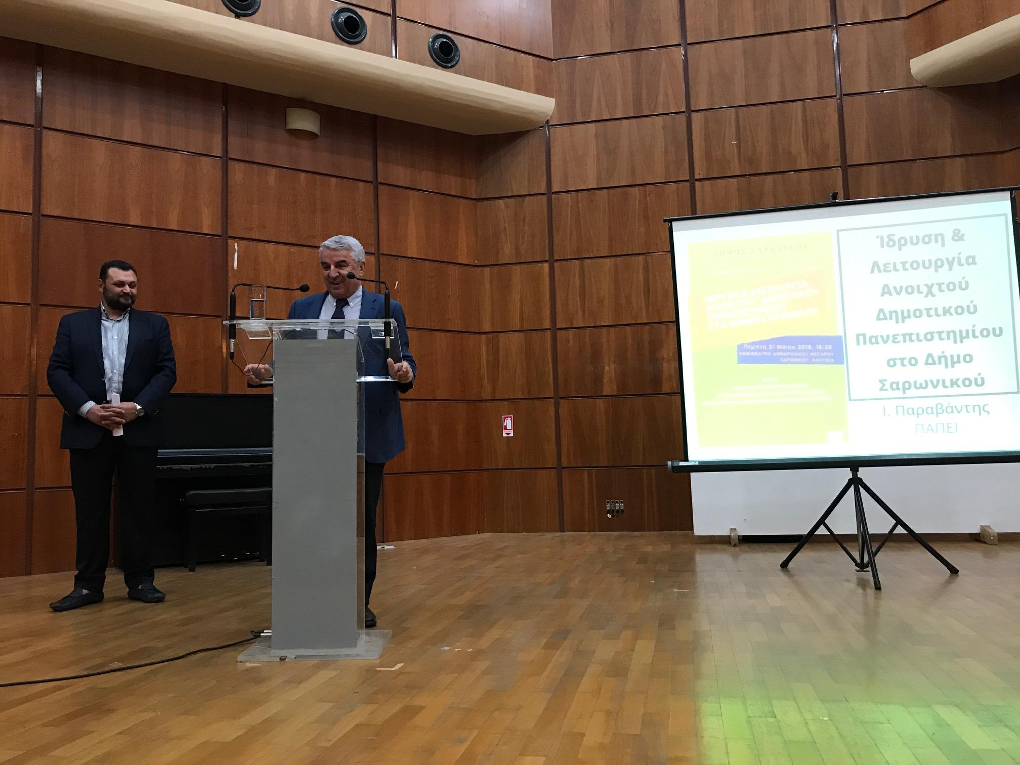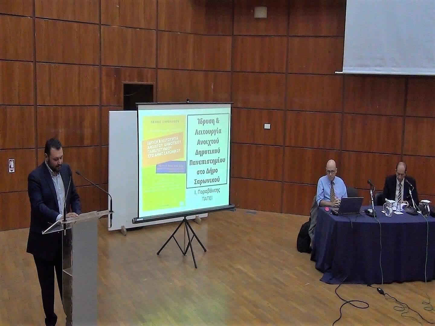 Οι στόχοι και το πλαίσιο λειτουργίας του Ανοιχτού Δημοτικού Πανεπιστημίου παρουσιάστηκαν σε ενημερωτική εκδήλωση, που πραγματοποιήθηκε την Πέμπτη 31 Μαΐουστο Αμφιθέατρο του Δημαρχιακού Μεγάρου του Δήμου Σαρωνικού, με ομιλητές τον Δήμαρχο Σαρωνικού, κ. Γιώργο Σωφρόνη, τον Καθηγητή του Πανεπιστημίου Πειραιώς, κ. Ευάγγελο Σαμπράκο και τον Αναπληρωτή Καθηγητή του Πανεπιστημίου Πειραιώς, κ. Ιωάννη Παραβάντη.