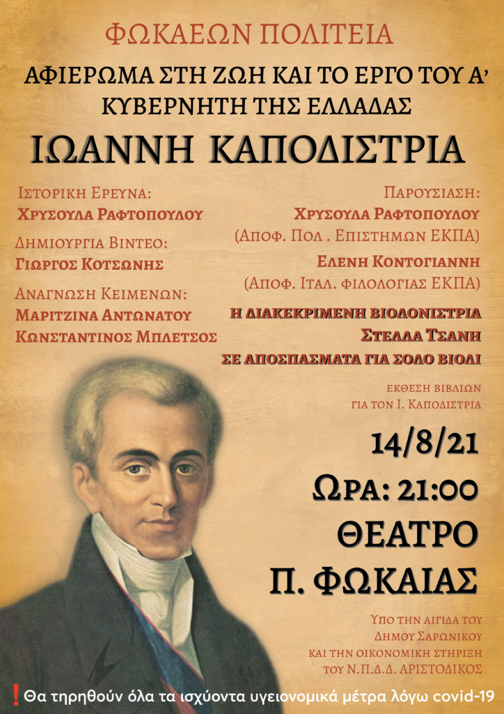 Οι «Ημέρες Πολιτισμού στον δήμο Σαρωνικού» συνεχίζονται με την εξ αναβολής αφιερωματική εκδήλωση που διοργανώνει η ΦΩΚΑΕΩΝ ΠΟΛΙΤΕΙΑ στη ζωή και το έργο του Α΄ Κυβερνήτη της Ελλάδας Ιωάννη Καποδίστρια, το Σάββατο 14 Αυγούστου και ώρα 21:00 στο θέατρο Παλαιάς Φώκαιας.