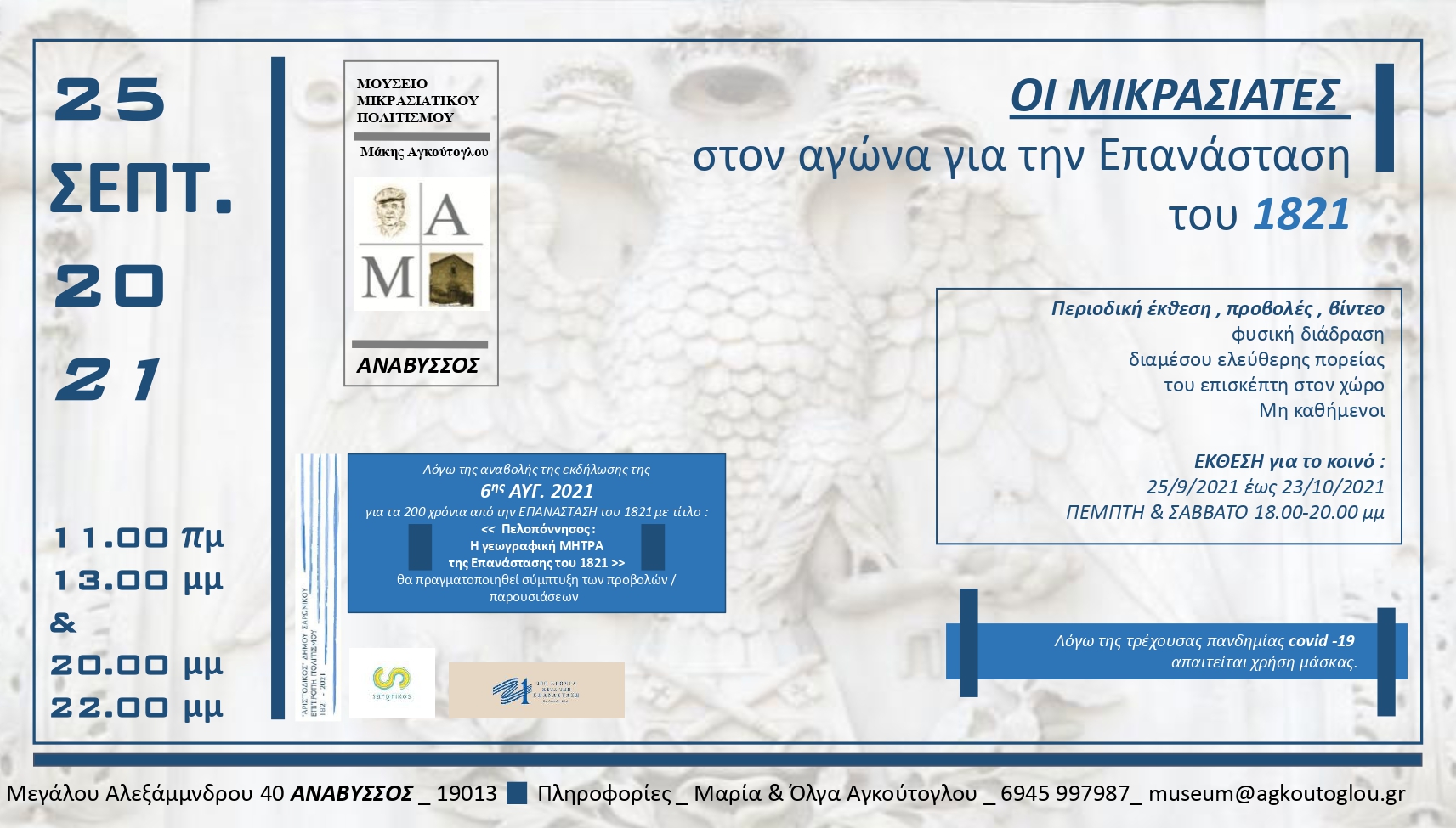ΗΜΕΡΕΣ ΠΟΛΙΤΙΣΜΟΥ ΣΤΟΝ ΔΗΜΟ ΣΑΡΩΝΙΚΟΥ. Διπλή διαδραστική έκθεση για το 1821: «Οι Μικρασιάτες στον Αγώνα για την Επανάσταση του 1821» – «Πελοπόννησος : Η γεωγραφική μήτρα της Επανάστασης του 1821». Μουσείο Μικρασιατικού Πολιτισμού «Μάκης Αγκούτογλου»