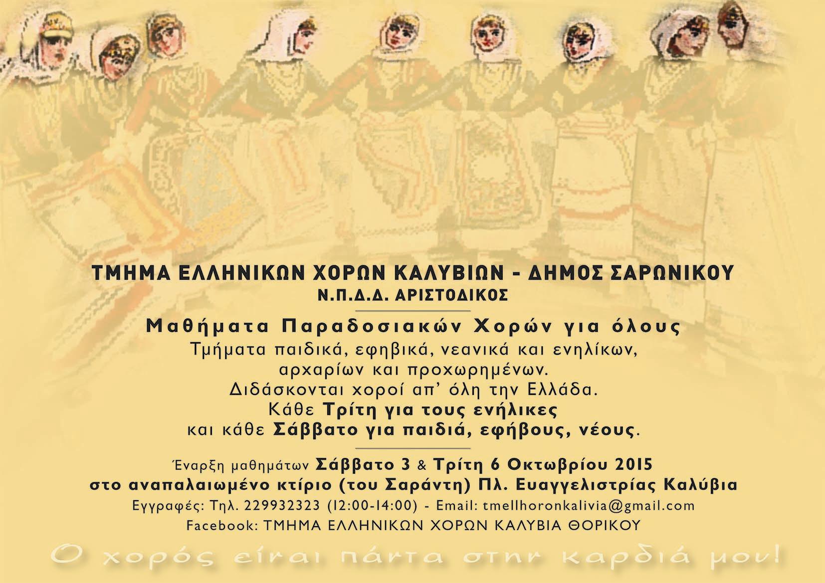 Η Δημοτική Φιλαρμονική και το Τμήμα Ελληνικών Χορών του Ν.Π.Δ. Δ. ΑΡΙΣΤΟΔΙΚΟΣ του Δήμου Σαρωνικού προσφέρουν και φέτος μαθήματα για όλους.
