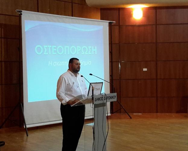 Ο Δήμαρχος Σαρωνικού, κ. Γιώργος Σωφρόνης στο χαιρετισμό του ευχαρίστησε αρχικά τον Σύλλογο «Πεταλούδα» για την προσφορά των δωρεάν εξετάσεων στους κατοίκους του Δήμου Σαρωνικού, αλλά και τον ορθοπαιδικό χειρουργό κ. Χρύσανθο Μυλωνά, ο οποίος στην παρουσίασή του εξήγησε όλες τις παραμέτρους της σοβαρής αυτής ασθένειας, η οποία ταλαιπωρεί μεγάλο αριθμό πολιτών. « Για δυο ημέρες οι συνδημότες μας εξετάστηκαν δωρεάν μέσω της κινητής μονάδας πρόληψης οστεοπόρωσης στον Δήμο μας. Είναι μια μόνο από τις πολλές δράσεις τις οποίες σχεδιάζουμε και στοχεύουμε στην πρόληψη ασθενειών που πλήττουν την υγεία μας. Ο Δήμος Σαρωνικού στοχεύει στην βελτίωση της ποιότητας ζωής των συνδημοτών μας και για το λόγο αυτό αντίστοιχες δράσεις πρόληψης και ενημέρωσης σε θέματα υγείας θα πραγματοποιούνται σε τακτά χρονικά διαστήματα».