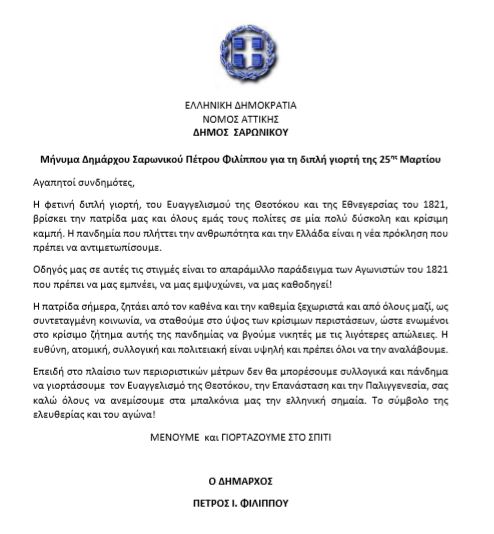 Επειδή στο πλαίσιο των περιοριστικών μέτρων δεν θα μπορέσουμε συλλογικά και πάνδημα να γιορτάσουμε τον Ευαγγελισμό της Θεοτόκου, την Επανάσταση και την Παλιγγενεσία, σας καλώ όλους να ανεμίσουμε στα μπαλκόνια μας την ελληνική σημαία. Το σύμβολο της ελευθερίας και του αγώνα!