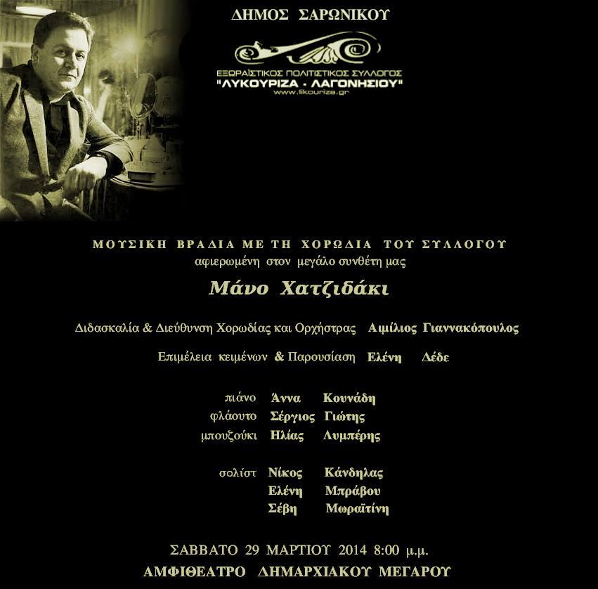 Μουσική βραδιά αφιερωμένη στον Μάνο Χατζιδάκι από τη Χορωδία του Συλλόγου “Λυκουρίζα Λαγονησίου”