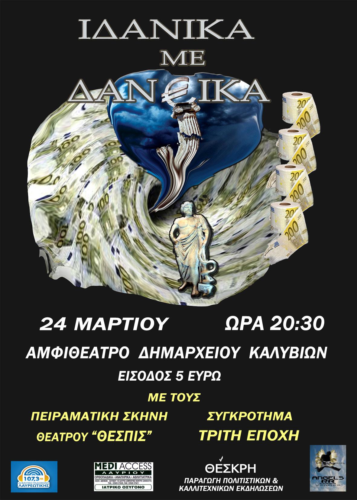 Η πειραματική θεατρική ομάδα «ΘΕΣΠΙΣ» και το μουσικό σχήμα «Tρίτη Eποχή» ανεβάζουν το Σάββατο 24 Μαρτίου 2012 και ώρα 8:30 μ.μ. στο Αμφιαθέατρο του Δημαρχείου Σαρωνικού μια ξεχωριστή μουσικό-θεατρική κωμική παράσταση με τίτλο «Ιδανικά με Δανεικά».