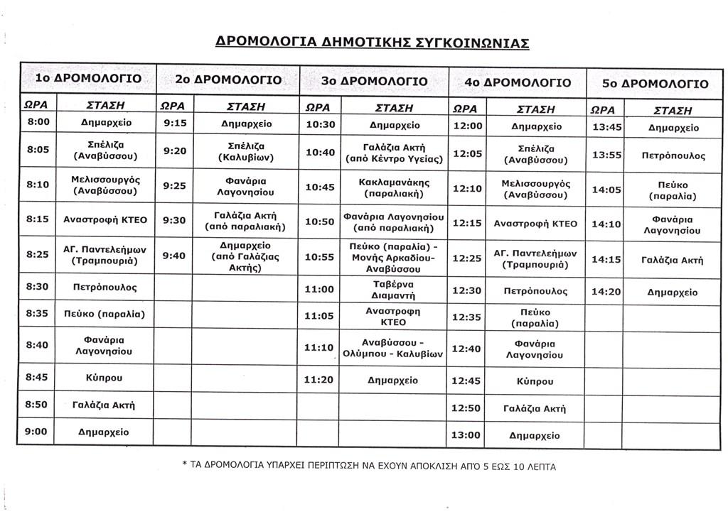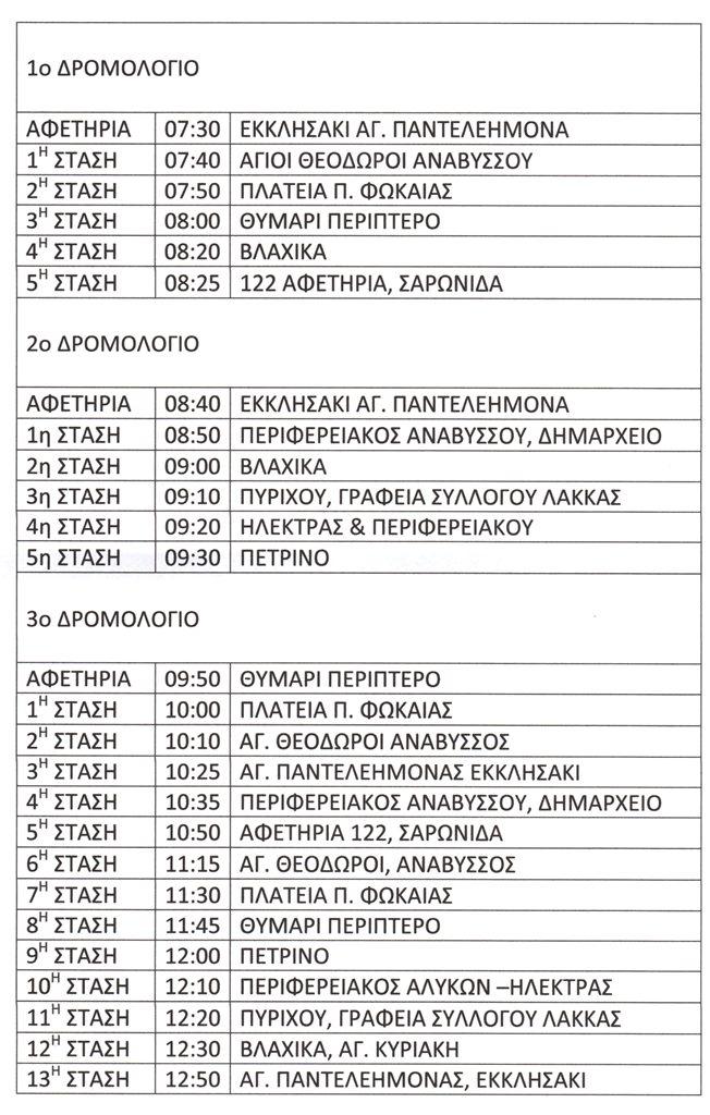 Ενόψει της καλοκαιρινής περιόδου και λαμβάνοντας υπόψη τις δυσκολίες μετακίνησης των κατοίκων, κυρίως των ηλικιωμένων, προκειμένου να διευκολυνθεί η δυνατότητα πρόσβασης στη θάλασσα αλλά και η καλύτερη σύνδεση με την αστική συγκοινωνία και το λεωφορείο 122, δρομολογούνται τρία (3) δρομολόγια με τις εξής διαδρομές: 1) Άγιος Παντελεήμονας Αναβύσσος- Αφετηρία 122 Σαρωνίδα, 2)Άγιος Παντελεήμονας Αναβύσσος – Πέτρινο, 3) Θυμάρι περίπτερο – Αφετηρία 122 Σαρωνίδα – Άγιος Παντελεήμονας Ανάβυσσος.