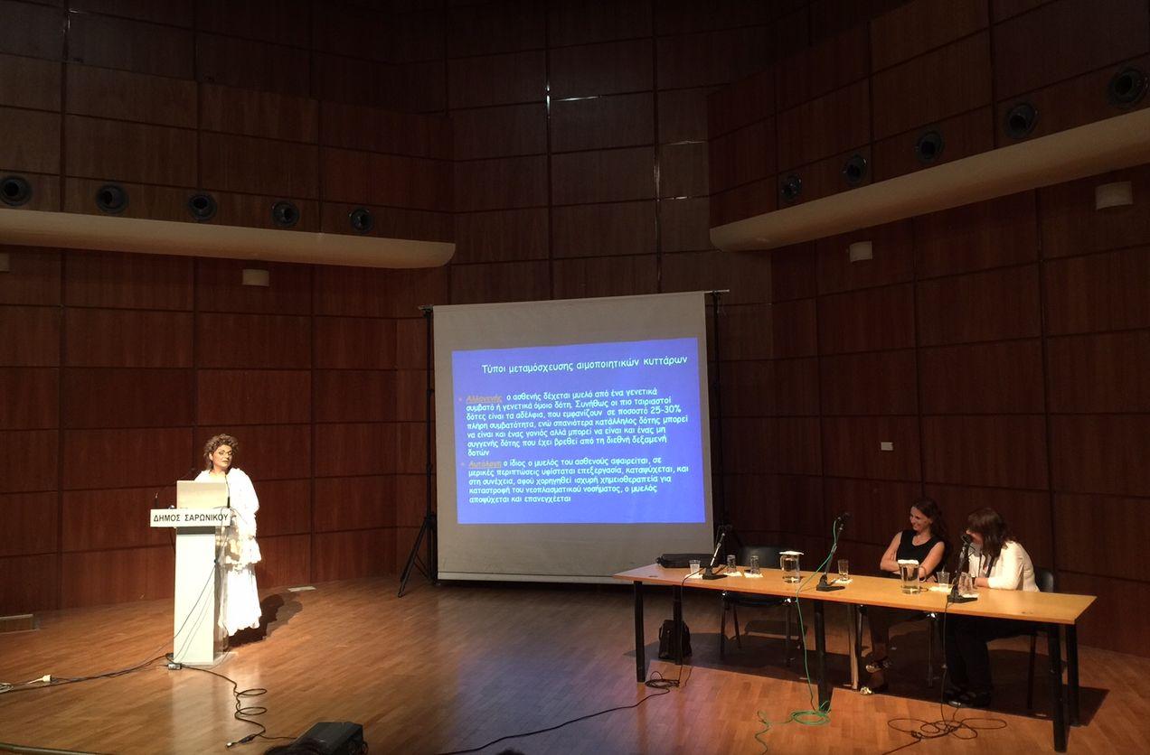 Η ιατρός, αιματολόγος κα. Γεωργία Αυγερινού παρουσίασε με λεπτομέρεια τι ακριβώς σημαίνει μεταμόσχευση αιμοποιητικών κυττάρων/ μυελού των οστών, τους τρόπους με τους οποίους πραγματοποιείται, τη διαδικασία που ακολουθείται προκειμένου να εγγραφεί κανείς ως δότης, ενώ έκανε και μια εκτενή αναφορά στην παγκόσμια και ελληνική πραγματικότητα. Είναι χαρακτηριστικό ότι στην Ευρώπη πραγματοποιούνται ετησίως 15.000 μεταμοσχεύσεις μυελού των οστών, ενώ στη χώρα μας ο αριθμός αγγίζει τους 200 ασθενείς. Από αυτούς οι περισσότεροι λαμβάνουν μόσχευμα από μη συγγενή εθελοντή δότη, καθώς οι πιθανότητες εύρεσης συμβατού δότη στο οικογενειακό και στενό φιλικό περιβάλλον είναι ελάχιστες. Τα μοσχεύματα σε αυτές τις περιπτώσεις αναζητούνται στο εξωτερικό, από την Παγκόσμια Τράπεζα, διότι ο αριθμός των ελλήνων δοτών είναι ιδιαίτερα μικρός.