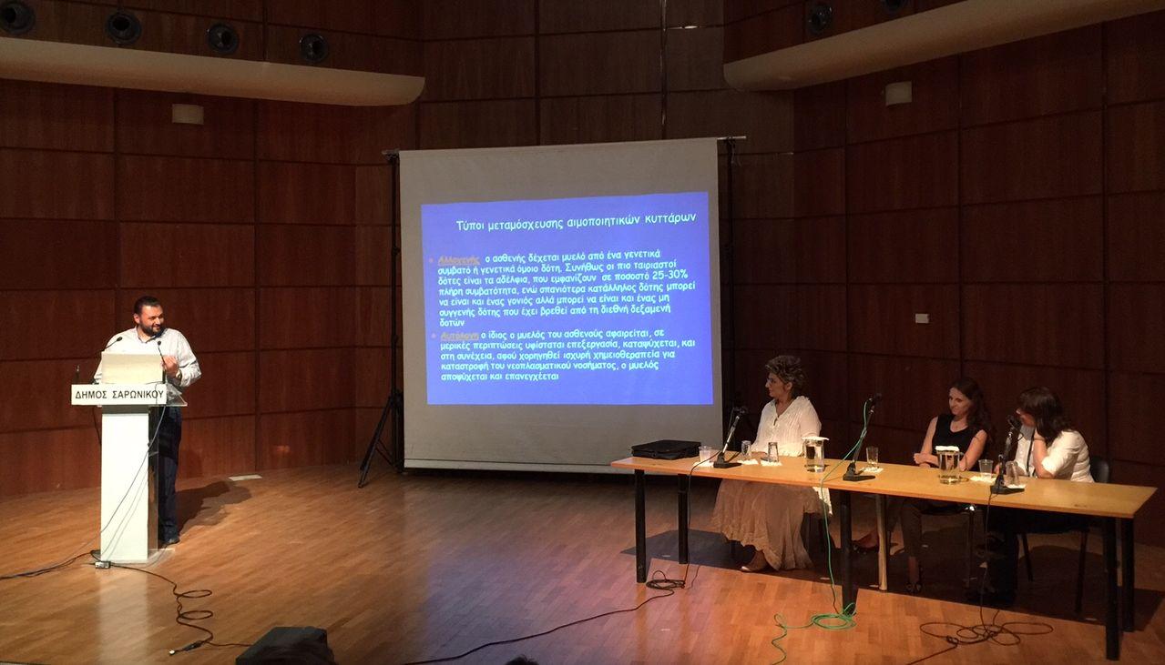 Ο Δήμαρχος Σαρωνικού, κ. Γιώργος Σωφρόνης, αρωγός και υποστηρικτής της προσπάθειας ευαισθητοποίησης του κοινού από την πρώτη στιγμή σημείωσε στον χαιρετισμός του: «Είμαι ιδιαίτερα χαρούμενος που πραγματοποιείται στον Δήμο μας η αποψινή εκδήλωση, καθώς αποτελεί μια ευκαιρία να ενημερωθούμε επαρκώς και εμπεριστατωμένως από επιστήμονες για το θέμα της μεταμόσχευσης αιμοποιητικών κυττάρων και τη διαδικασία εγγραφής ως εθελοντές. Ομολογώ ότι και ο ίδιος ήμουν ανεπαρκώς ενημερωμένος μέχρι πρόσφατα, αλλά επ’ ευκαιρία της εκδήλωσης μελέτησα και χαίρομαι που απόψε θα μας λυθεί κάθε απορία».