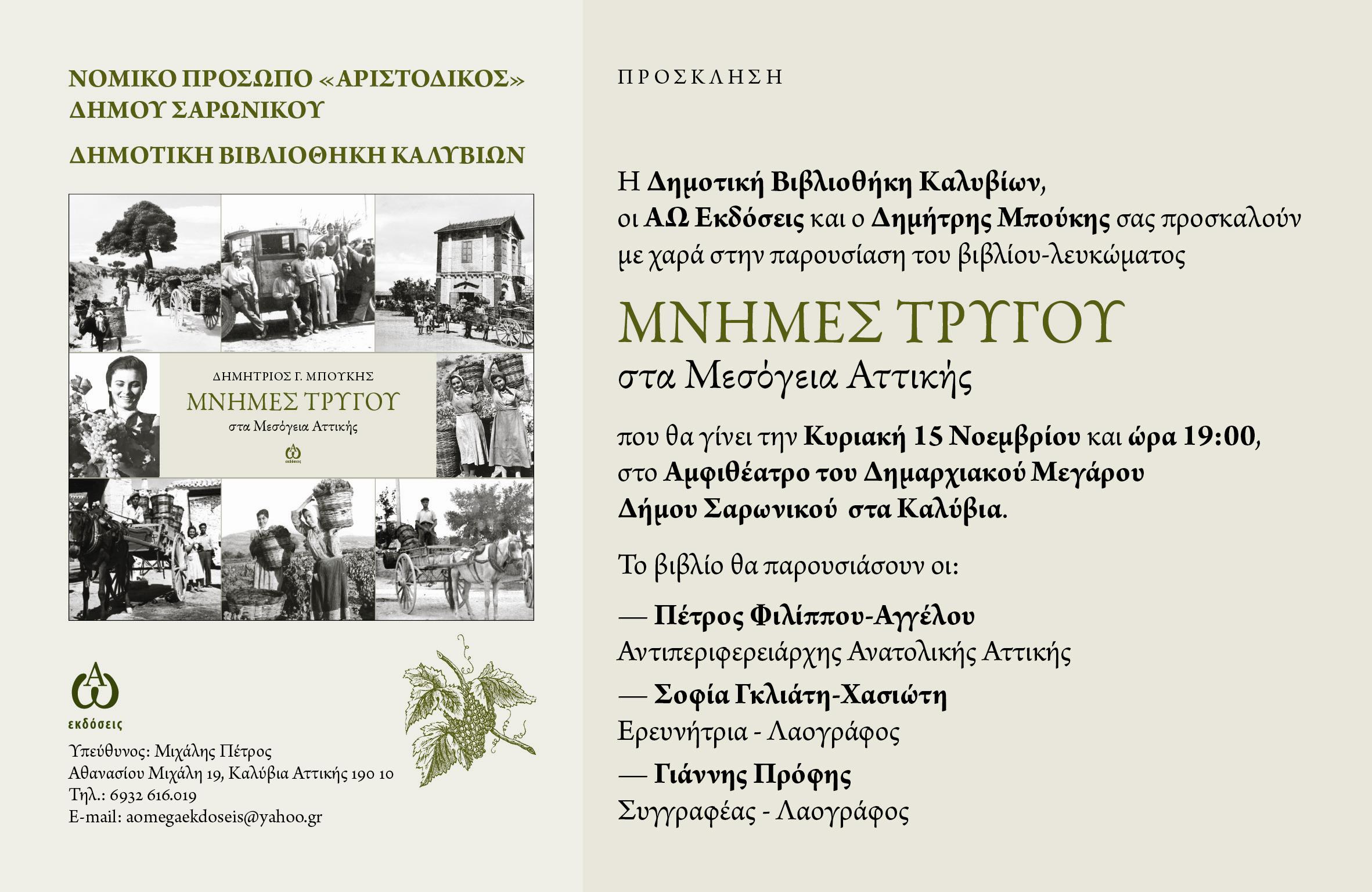 Η Δημοτική Βιβλιοθήκη Καλυβίων του ΝΠΔΔ Αριστόδικος, οι ΑΩ Εκδόσεις και ο Δημήτρης Μπούκης παρουσιάζουν το βιβλίο – λεύκωμα «Μνήμες Τρύγου στα Μεσόγεια Αττικής», την Κυριακή 15 Νοεμβρίου. Η παρουσίαση του βιβλίου θα πραγματοποιηθεί στις 19:00 στο Αμφιθέατρο του Δημαρχιακού Μεγάρου Σαρωνικού, στα Καλύβια.