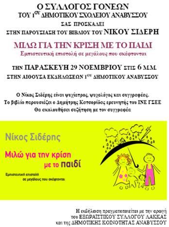 Παρουσίαση του βιβλίου “Μιλώ για την κρίση με το παιδί” του Νίκου Σιδέρη από τον Σύλλογο Γονέων του 1ου Δημοτικού Σχολείου Αναβύσσου