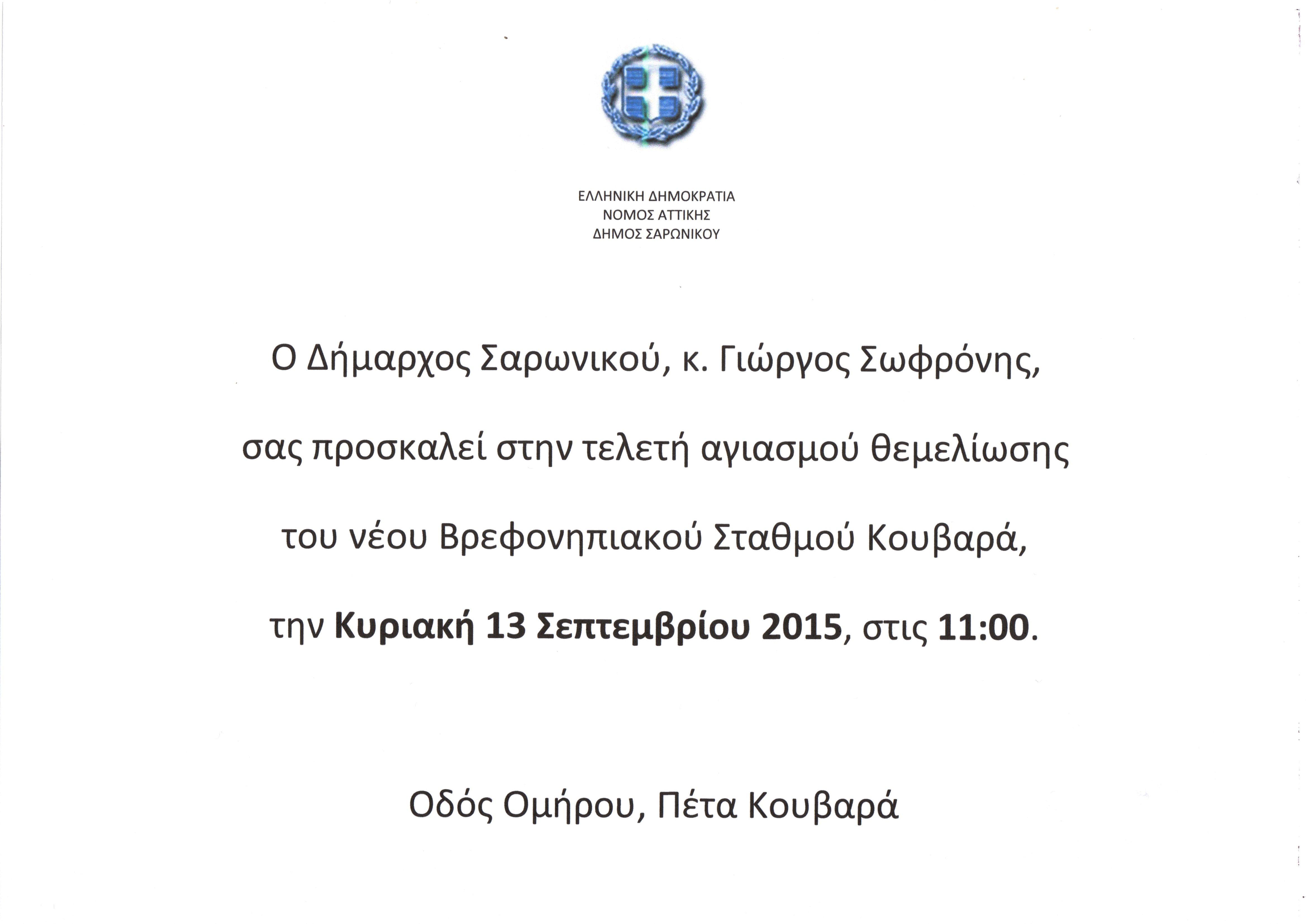 Πρόσκληση στον Αγιασμό Θεμελίωσης του Νέου Βρεφονηπιακού Σταθμού στον Κουβαρά