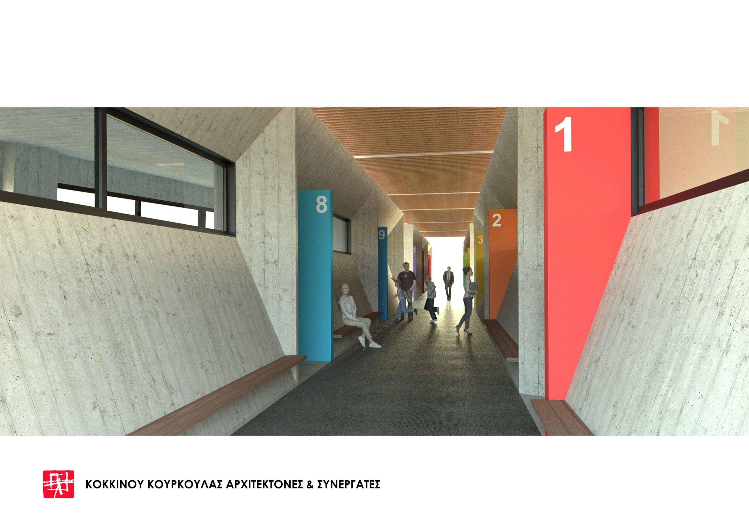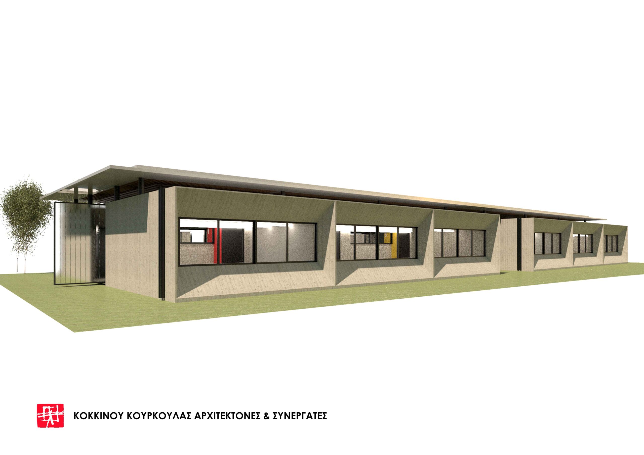 Στην κορυφή του κτιρίου τοποθετείται ελαφρύ μεταλλικό στέγαστρο που αποτελεί κεντρικό στοιχείο του ειδικού βιοκλιματικού σχεδιασμού. Αξιοποιείται για φυσικό εξαερισμό και δροσισμό το καλοκαίρι αλλά και για θέρμανση δια ακτινοβολίας τον χειμώνα.