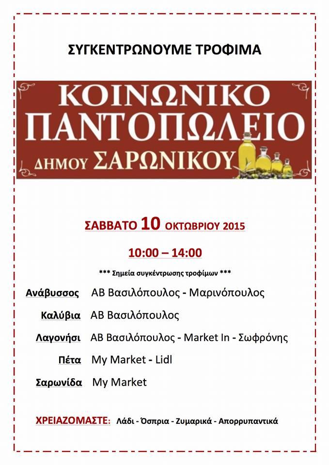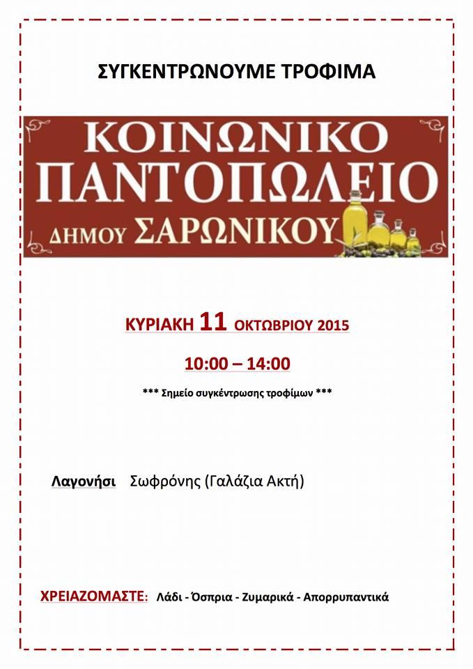 Το Σαββατοκύριακο 10 & 11 Οκτωβρίου 2015 οι εθελοντές του Κοινωνικού Παντοπωλείου του Δήμου Σαρωνικού θα βρίσκονται σε επιλεγμένα σημεία σε όλο τον Δήμο για να συγκεντρώσουν τις προσφορές των συμπολιτών μας σε τρόφιμα και είδη καθαρισμού.