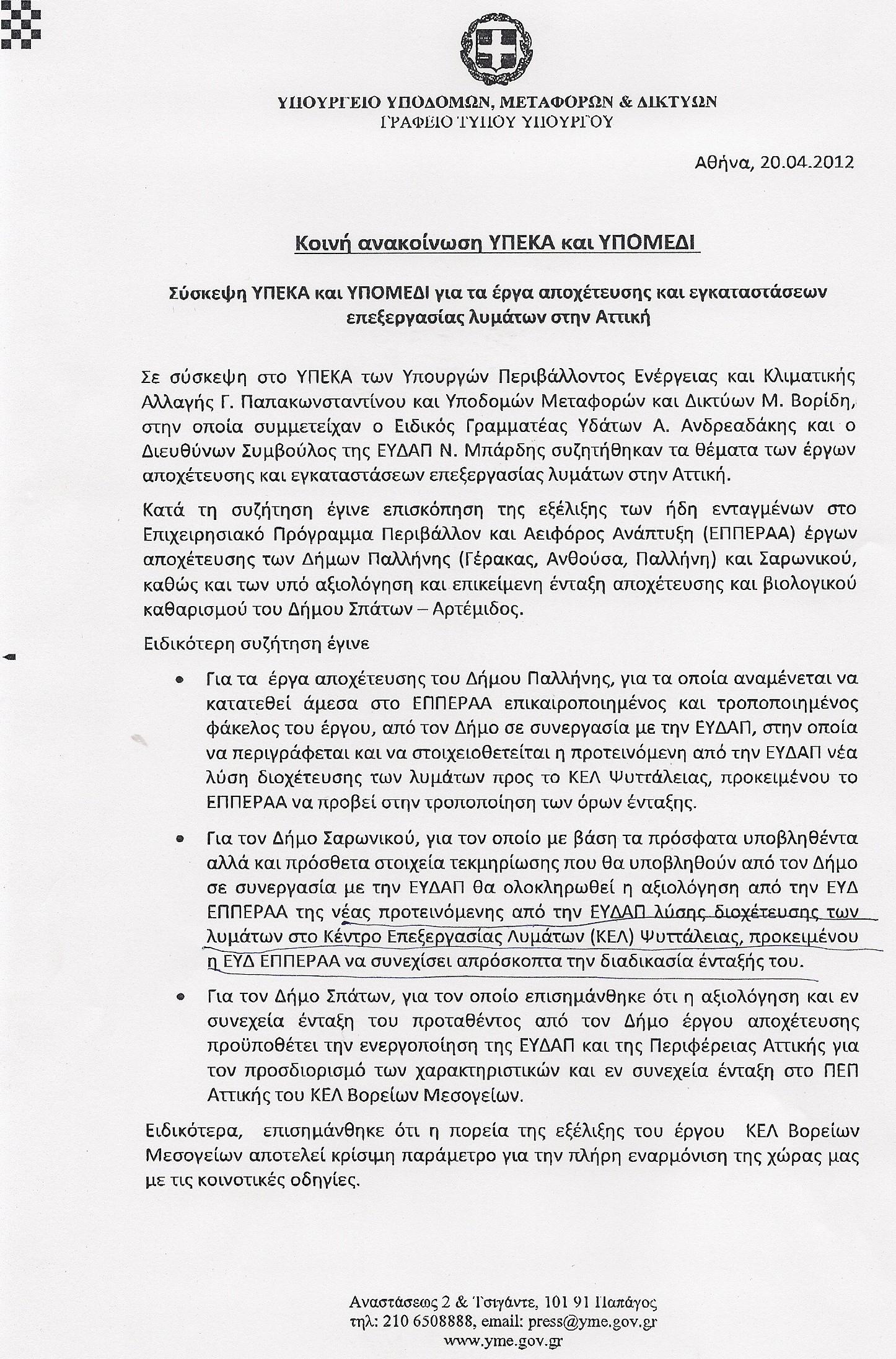Με κοινή ανακοίνωση των Υπουργών ΥΠΕΚΑ και ΥΠΟΜΕΔΙ κ.κ. Γιώργου Παπακωνσταντίνου και Μάκη Βορίδη (την οποία επισυνάπτουμε), αποφασίστηκε  οριστική λύση για το αποχετευτικό ζήτημα στο Δήμο Σαρωνικού με  τη «διοχέτευση των λυμάτων του δήμου στο ΚΕΛ της Ψυτάλλειας».