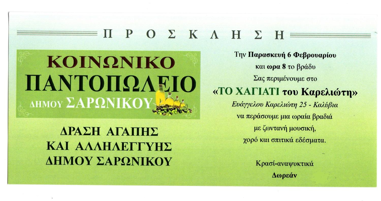 Η συμμετοχή όλων μας, βάσει των δυνατοτήτων του καθενός, δεδομένου της οικονομικής κατάστασης, θα ενισχύσει τη συγκεκριμένη προσπάθεια. Για την ενίσχυση του Κοινωνικού Παντοπωλείου διοργανώνεται βραδιά αφιερωμένη σ’ αυτό το σκοπό την Παρασκευή, 6 Φεβρουαρίου στις 20:00, στο «Χαγιάτι του Καρελιώτη», στα Καλύβια. Μια βραδιά γεμάτη μουσική και διασκέδαση, μια βραδιά για καλό σκοπό. Μια βραδιά αφιερωμένη στους συνδημότες μας, μια βραδιά από καρδιάς.