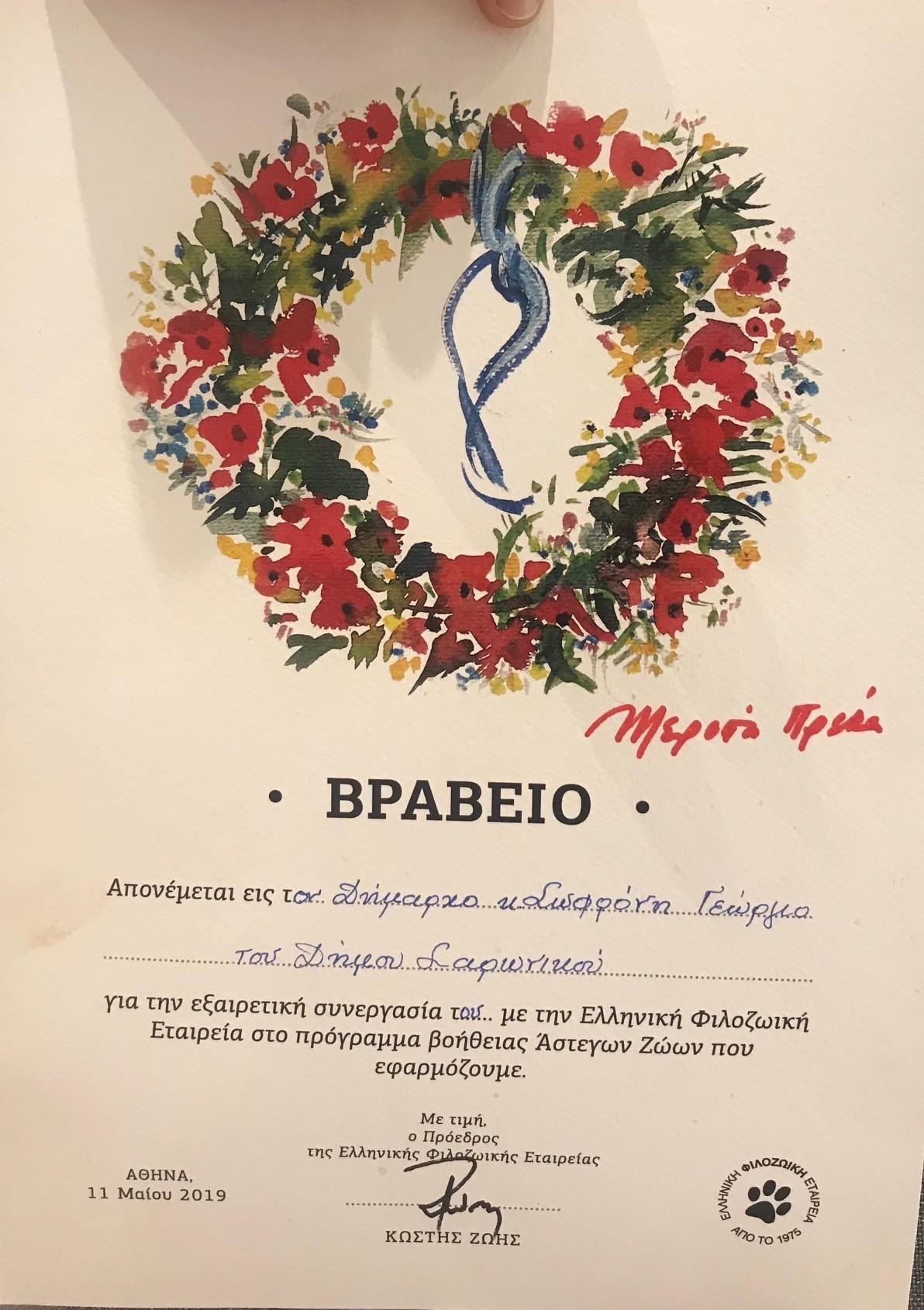 Το Σάββατο 11 Μαΐου 2019 η Ελληνική Φιλοζωική Εταιρεία βράβευσε το Δήμαρχο Σαρωνικού κ. Γιώργο Σωφρόνη για τη συνολική συνεισφορά του Δήμου στην προστασία των αδέσποτων ζώων και την εφαρμογή του προγράμματος βοήθειας για την περίοδο 2018-19.